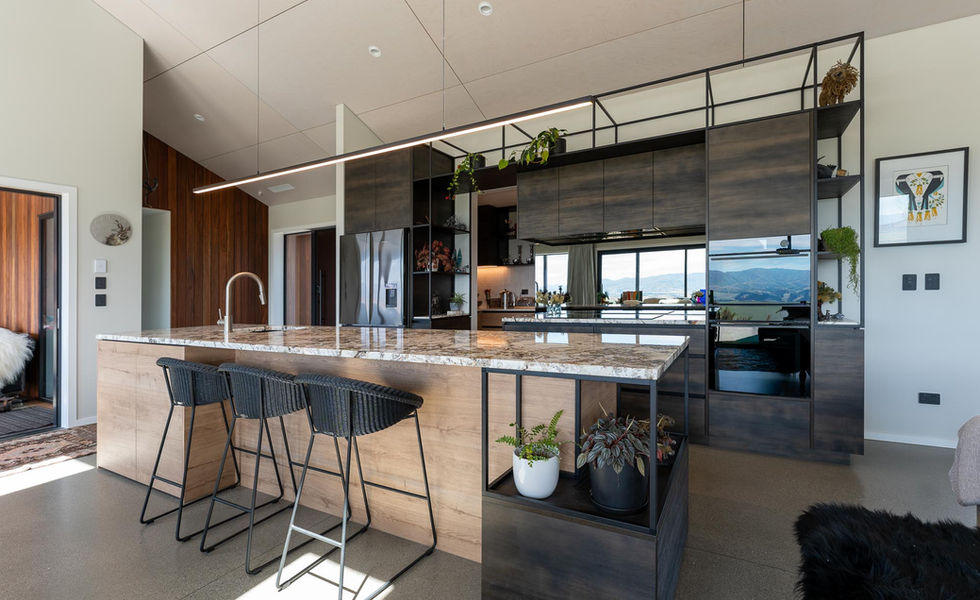 Set among manuka bushes on Bendigo Ridge in Tarras, this property offers sweeping views of Dunstan valley, Queensberry, St Bathans, Wanaka, and Lindis Pass. The kitchen features a natural stone benchtop with petrified wood, open steel shelving for displaying travel finds, and textured cabinets with gold accents that complement the overall look.