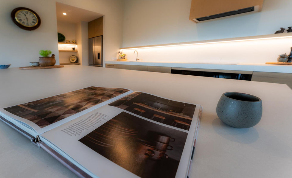 Design Collaboration between LeighWells.Design and Arrowtown Design. This Kitchen Design uses a natural-toned palette, Caesarstone Cloudburst benchtop, and oak veneer cabinets with horizontal grain and bandsawn texture. The textured plaster walls and handle-less cabinets create an elegant, sophisticated look.